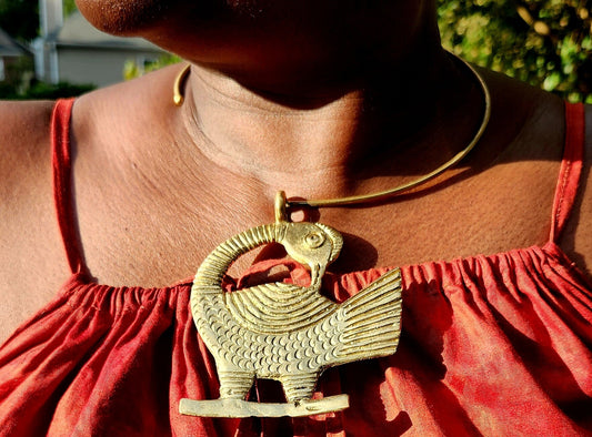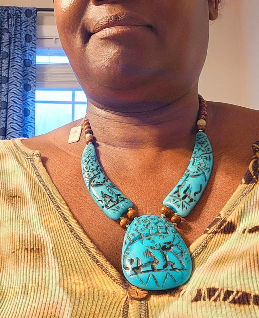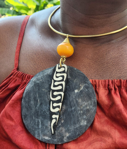 Original Chunky Batik Bone and Horn Necklace/Chunky wooden Pendant and Adjustable Bone Rings.