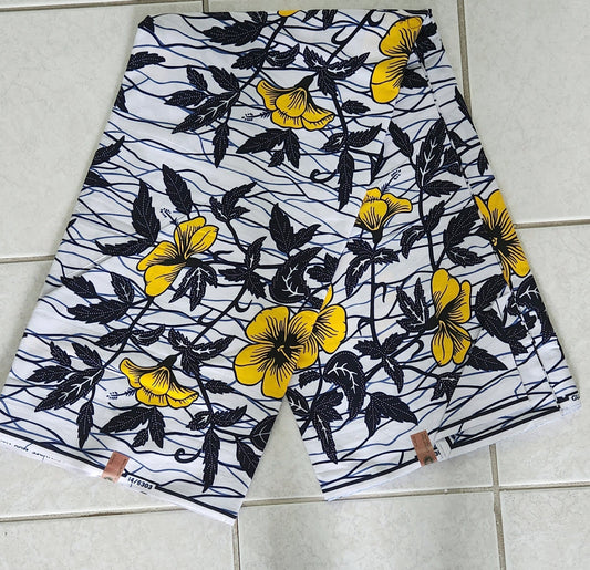 African Print Fabric, Yellow Hibiscus Garden Print/Floral White and Black/by yard or 6yd bulk.