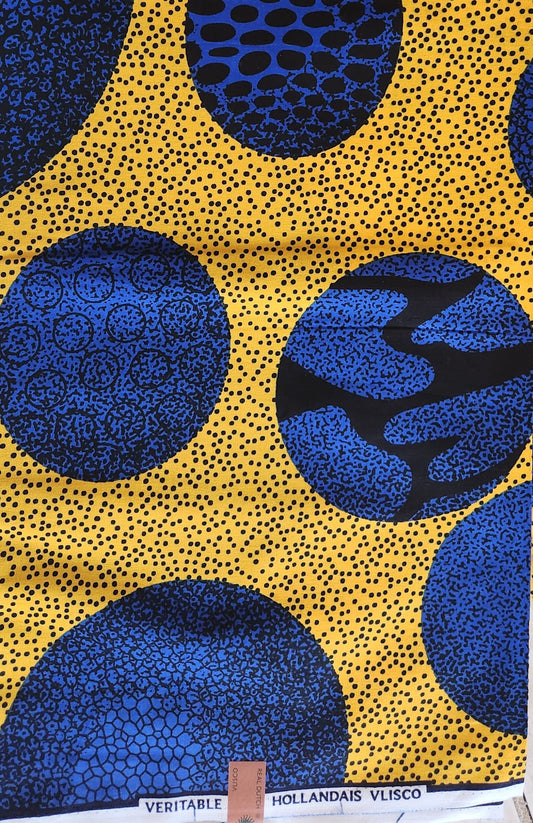 African Print Ankara featuring Multicolor Blue Polka dot in yellow . Sold by yard/6 Yards.