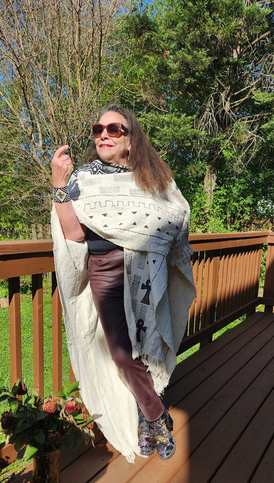 Bogolan White African Mudcloth Poncho Scarf/split in the middle and both sides/Unisex 100% Cotton made in Mali.