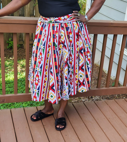 African Ankara Midi Skirt/ Dashiki Print Skirt elastic waist with a tie and pockets. One size fits S- XL.