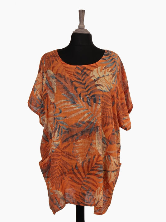 Plus Size Italian Leaf Printed Front Pockets Detail Batwing Top