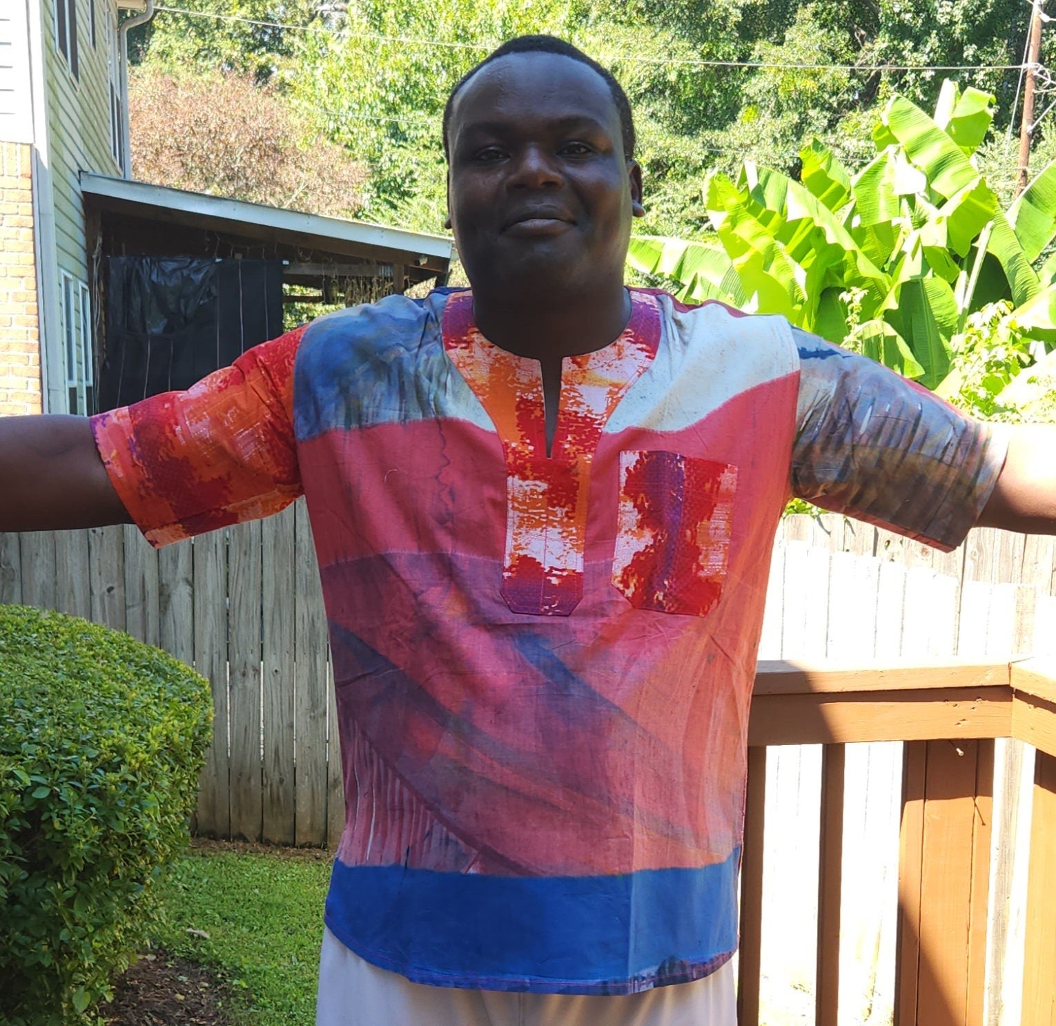 Minala Ankara Splash Kitenge Shirt is so unique and beautiful. We call it splash because the colours are not consistent in the entire fabric.